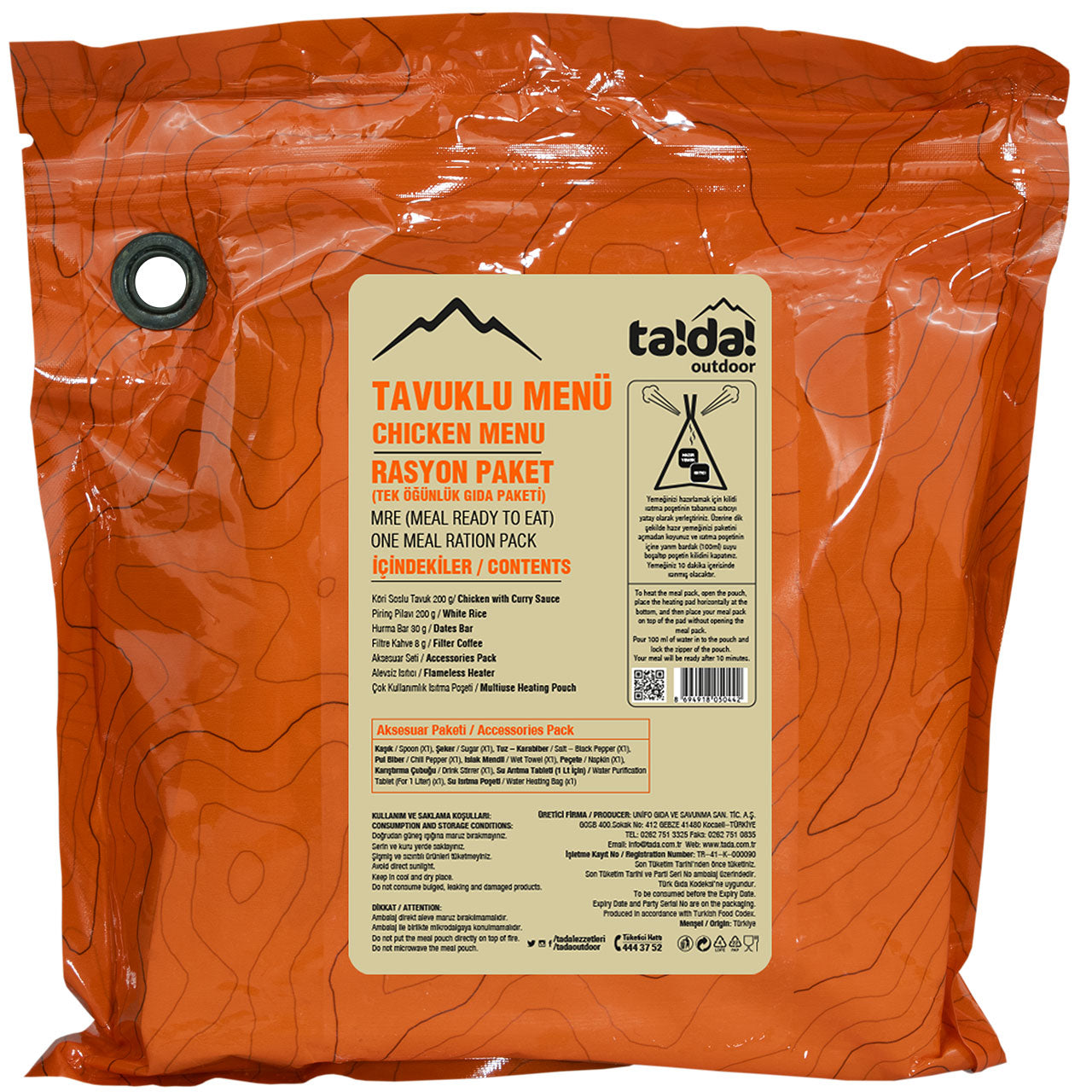 tada! Tek Öğünlük Gıda Paketi-Tavuklu Menü, yüksek protein içeriğiyle pratik ve doyurucu bir lezzet olarak karşınıza çıkıyor. Ürünün darbelere karşı dayanıklı olan ambalajı, kamp ortamlarında muhafaza edilmesini kolaylaştırıyor. Kuş gözü sayesinde karabina ile çantaya takarak kolay taşıyabileceğiniz tada! Tek Öğünlük Gıda Paketi-Tavuklu Menü paketinin içerisinde; kişisel ihtiyaçlar için aksesuar seti, içme suyu ihtiyacını karşılamak içinse doğada bulduğunuz herhangi bir su birikintisini içilebilir hâle getiren su arıtma tableti bulunuyor. 1 kişinin bir öğünlük yemek ihtiyacını rahatlıkla karşılayan tada! Tek Öğünlük Gıda Paketi-Tavuklu Menü, toplam 550 gram ağırlığında ve 905 kalori değerinde olmasıyla dikkat çekiyor. Özenle seçilen malzemelerle yapılan ta!da! ürünleri, size lezzetli öğünler sunuyor ve doğa gezilerinde vazgeçilmeziniz olmayı hedefliyor. Özetle ta!da! Tek Öğünlük Gıda Paketi-Tavuklu Menü, kamp sofralarınızda size eşlik etmek üzere ev yapımı tadında hazırlanıyor.